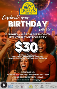 January through March birthdays deserve something special, and Duffy’s Tavern & Grille has you covered. Bring your crew together and enjoy a simple, fun, and affordable birthday celebration.